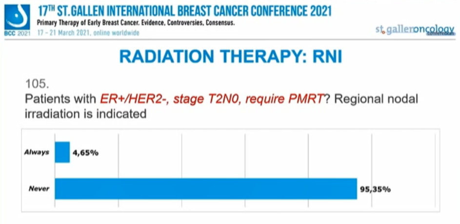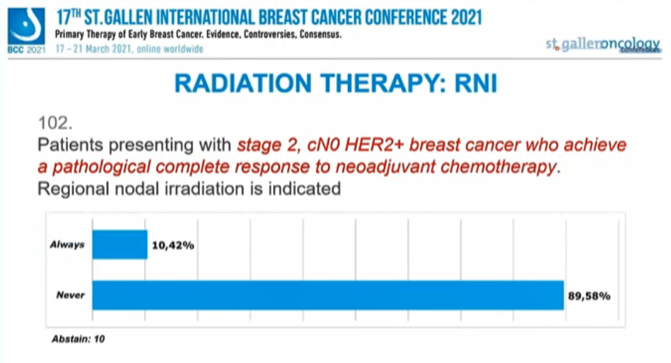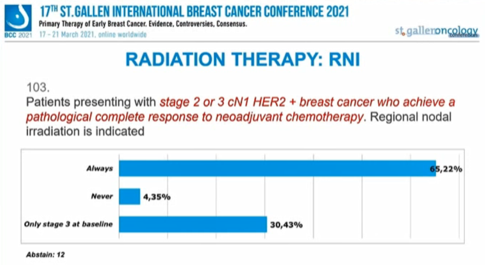 对于2期或3期、cN1的HER2+患者,65.22%的专家持肯定意见,4.35%的专家持否定意见,30.43%的专家认为“3期”患者才需要RNI,另有12人弃权。