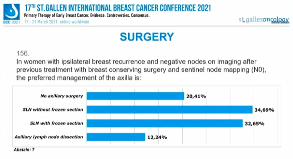 20.41%的专家认为“不需要腋窝手术”,34.69%的专家认为首选“无冰冻切片的SLN”,32.65%的专家首选“有冰冻切片的SLN”,12.24%的专家首选“腋窝清扫”,另有7人弃权。