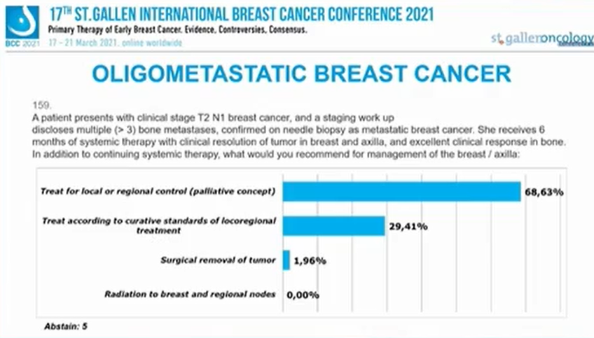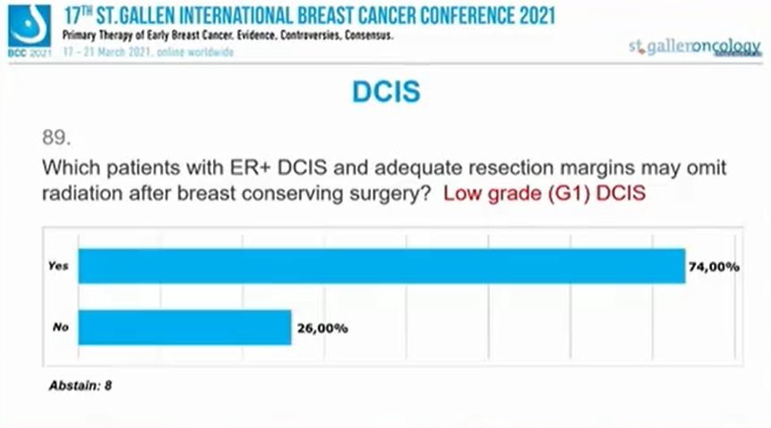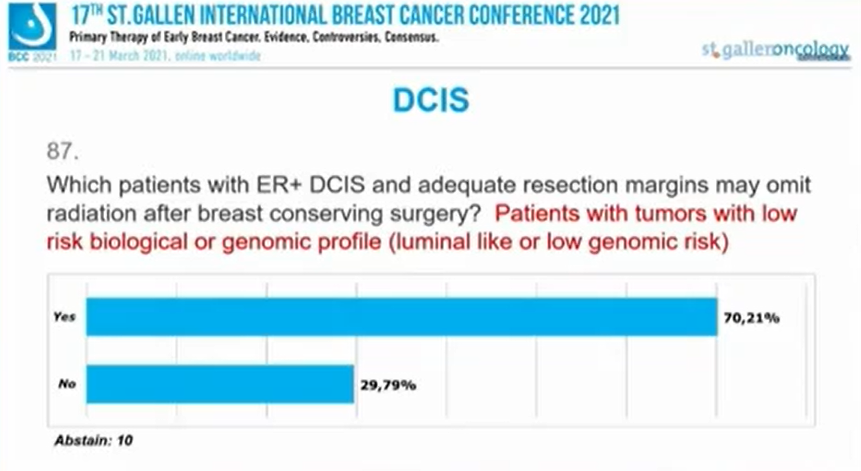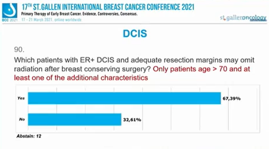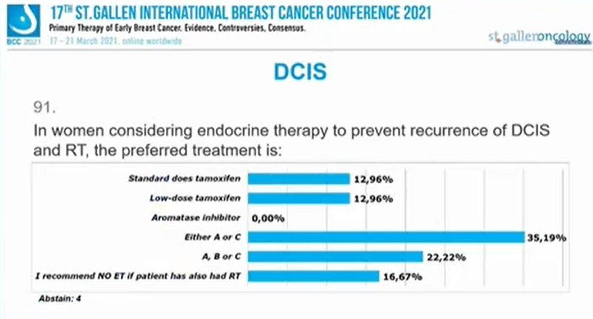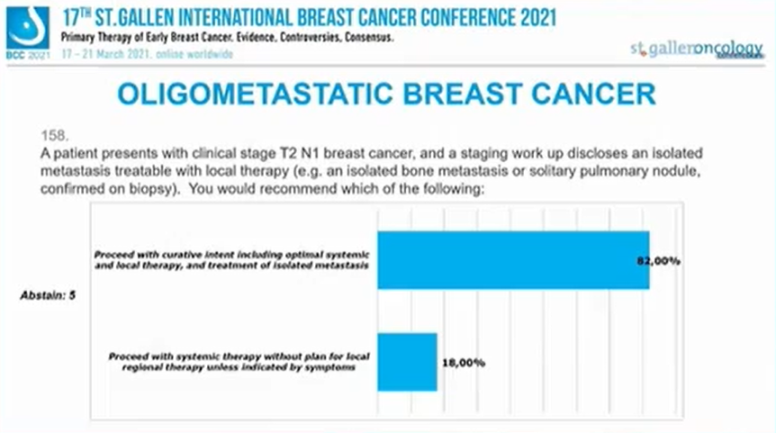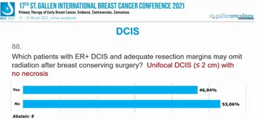编者按:当地时间3月21日,在Eric Winer教授的主持下,第十七届圣加伦国际乳腺癌大会(SG-BCC 2021)的专家完场了第二场投票,本文总结“乳腺导管原位癌(DCIS)”、“乳腺癌寡转移”、“新冠与乳腺癌治疗”的专家投票结果。
