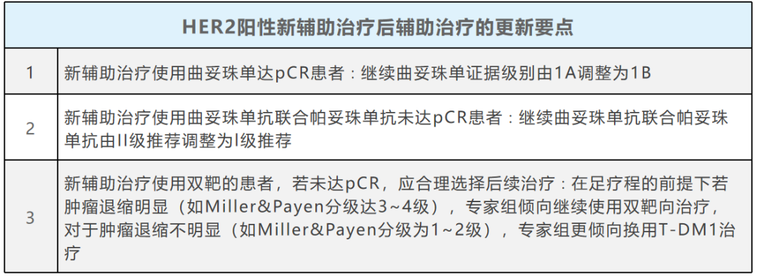 对于HER2阳性新辅助后的辅助治疗选择,除了“达到pCR”和“未达到pCR”的分层,专家组还进一步将未达到pCR的患者细分为“肿瘤明显退缩(如MP 3~4级)”和“肿瘤退缩不明显(如MP 1~2级)”。