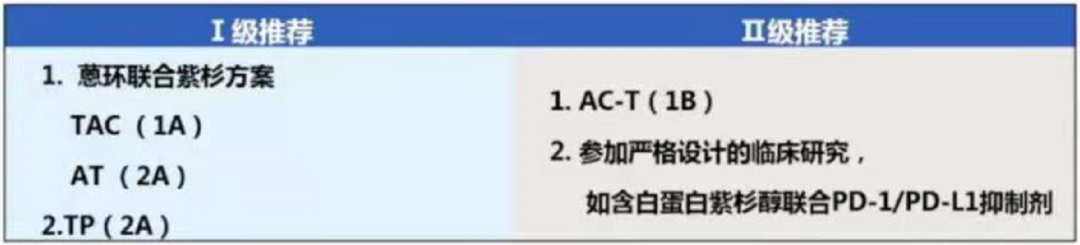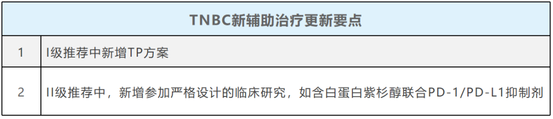 已有GeparSixto、CALGB 40603等研究提示铂类可提高TNBC患者pCR率,新版CSCO-BC指南在TNBC新辅助治疗Ⅰ级推荐中增加了TP方案。此外,KEYNOTE-522、IMpassion-031等研究也提示PD-1/PD-L1抑制剂可提高TNBC患者pCR率,考虑到尚未有适应证,CSCO-BC指南Ⅱ级推荐中增加了参加此类临床研究的建议。
