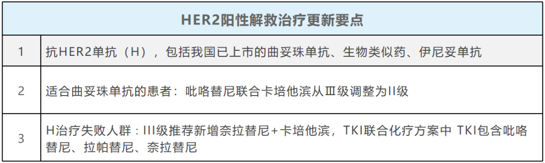 对于晚期HER2阳性乳腺癌的解救治疗,新版CSCO-BC指南同样凸显了“中国特色”,在国内已上市的抗HER2单抗中,除了有曲妥珠单抗以外,还有相关的生物类似药,国产原研伊妥尼单抗等选择。适合曲妥珠单抗的患者中,吡咯替尼联合卡培他滨的推荐级别由Ⅲ级调整为Ⅱ级。