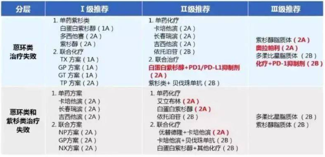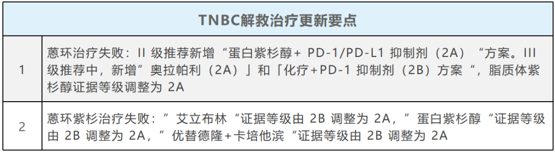 对于蒽环类治疗失败的TNBC患者,基于IMpassion130研究,新版指南Ⅱ级推荐中增加了“白蛋白紫杉醇+ PD-1/PD-L1抑制剂(2A)”方案。在Ⅲ级推荐中,新增“奥拉帕利(2A)”和“化疗+PD-1抑制剂(2B)方案”,脂质体紫杉醇证据等级调整为2A。