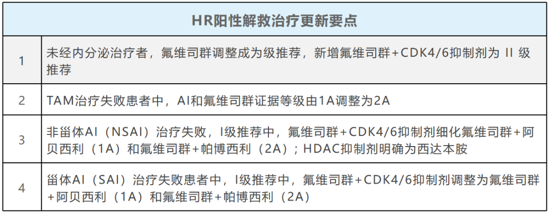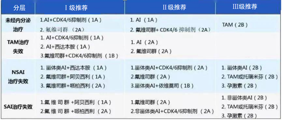 对于未经内分泌治疗者,FALCON研究证实了单药氟维司群可延长PFS,一些靶向治疗研究中也将氟维司群作为联合对象,因此,新版指南将氟维司群调整成为Ⅰ级推荐,并新增氟维司群+CDK4/6抑制剂为Ⅱ级推荐。