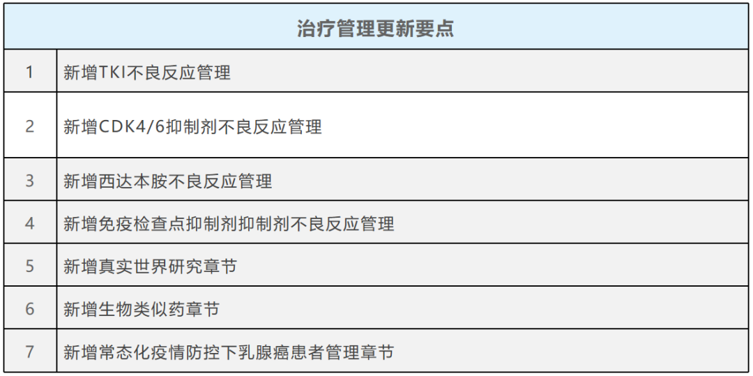 因此,新版CSCO-BC指南新增了TKI、CDK4/6抑制剂、西达本胺、免疫检查点抑制剂等不良反应的管理,并考虑真实世界研究的价值,关注生物类似药的临床应用而新增了专门的章节;此外,新版指南还满足临床需求,增加了常态化疫情防控下乳腺癌患者管理章节。