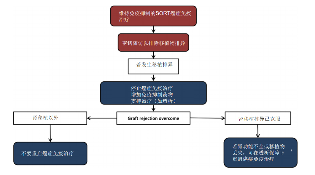 如果发生移植物排异,则应使用大剂量皮质类固醇或其他免疫抑制疗法。如果是肾脏移植,通常需要进行透析(证据等级V,推荐等级A)。发生抑制物排斥后,必须停止癌症免疫治疗,直至完全康复(证据等级V,推荐等级A)。