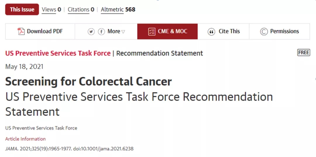 近日,美国预防服务工作组(USPSTF)在JAMA上发表了结直肠癌筛查的最新建议。
