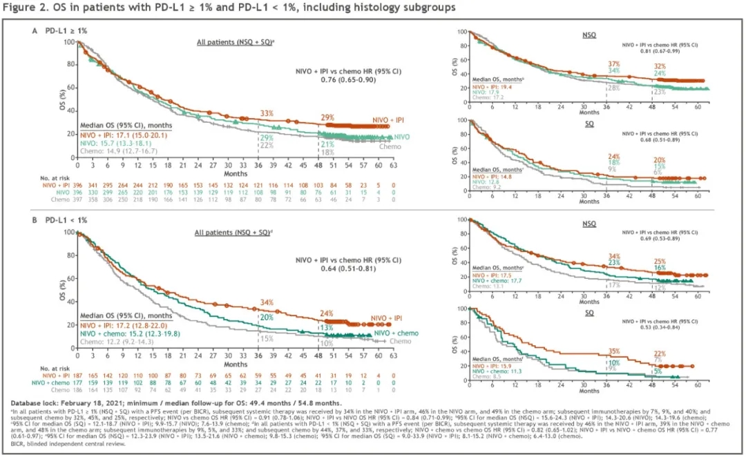PD-L1≥50%的患者中,接受纳武利尤单抗/伊匹木单抗治疗的患者的4年中位OS为21.2个月(95% CI: 15.5-31.6),相对于化疗组的HR为0.66 (95% CI: 0.52-0.84)。单独接受纳武利尤单抗的患者中位OS为18.1个月(95% CI: 14.4-22.1),与化疗相比的HR为0.64 (95% CI: 0.51-0.81),接受化疗的患者OS为14.0个月(95% CI: 10.0-18.6);