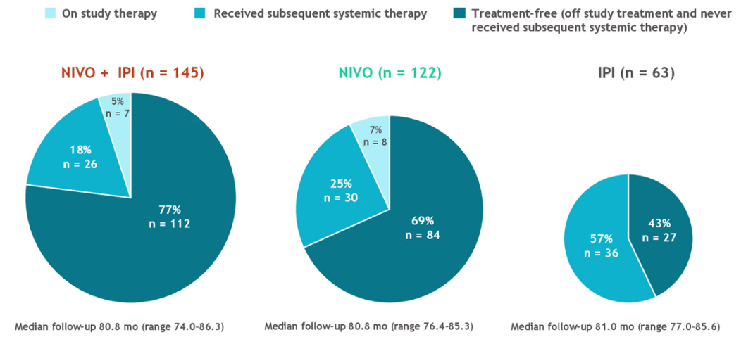 3组的中位无治疗间隔(不包括在开始后续全身治疗前停止随访的患者)分别为 27.6个月(范围,0-83.0)、2.3个月(范围,0.2-81.6)和1.9个月(范围,0.1-81.9)。在存活并接受随访的患者中,3组各有112/145(77%;NIVO + IPI)、84/122(69%;NIVO)和 27/63(43%;IPI)的患者停止试验治疗且一直未接受过后续的全身治疗,各有7、8和0名患者仍在接受试验治疗。3组患者的3/4 级治疗相关不良事件发生率分别为:59%、24%和 28%。自5年分析以后,没有观察到新的安全信息,也没有发生额外的治疗相关死亡。