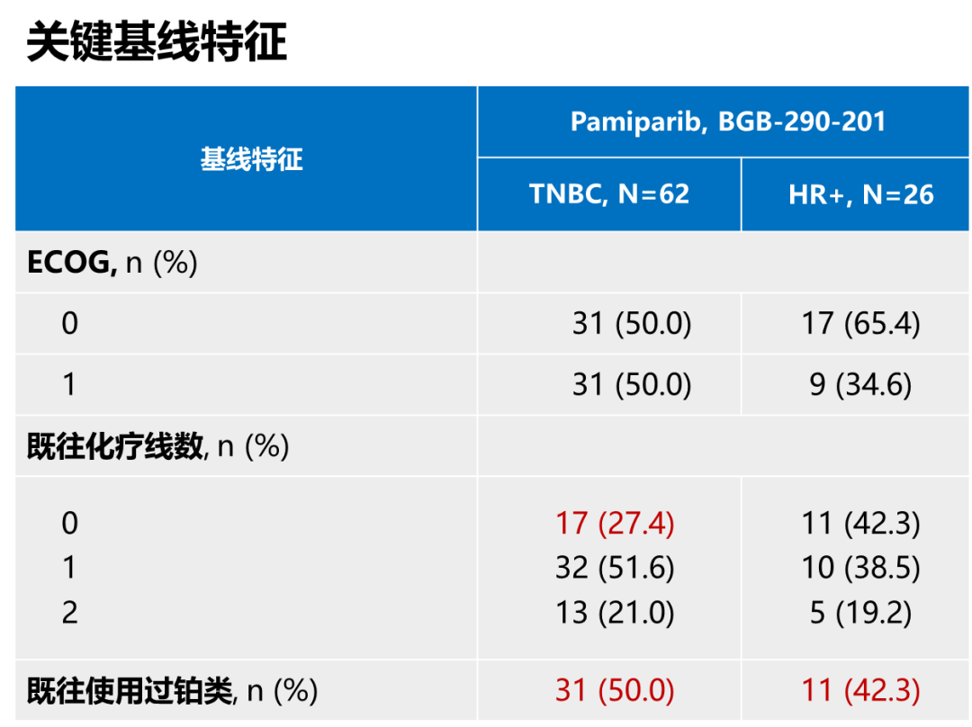疗效数据需要结合入组基线特征比较分析才能发现产生差异的原因。BGB-290-201研究与同类研究相比,TNBC组纳入较少的未接受过化疗患者(仅为27.4%),而且有更高的既往使用过铂类比例(TNBC组为50%,HR+/HER2-组为42.3%),中国专家更接受铂类在晚期TNBC一线应用,而国外专家更多将铂类应用在(新)辅助阶段,因此国外研究人群有更长的无铂间隔。BGB-290-201研究入组人群中应用过铂类比例相对较高,无铂间隔相对较短,这可能是帕米帕利在TNBC组ORR数据略低的主要原因。