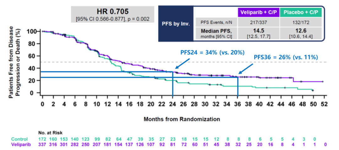 在BROCADE3研究中,对晚期HER2阴性gBRCAm乳腺癌中通过Veliparib 联合卡铂和紫杉醇,中位PFS达到14.5个月,比对照组(12.6个月)高出1.9个月,HR=0.705,P=0.002,达到统计学差异,降低约30%的疾病进展风险。但在解释BROCADE3研究到后期才分离的PFS曲线也须谨慎,有两个关键原因:首先,相当大比例停止联合化疗且无疾病进展的患者仍在继续接受Veliparib单药治疗,可能是Veliparib单药治疗驱动PFS曲线分离;其次,2年或3年PFS率并非乳腺癌OS获益的替代终点。通过对BROCADE3研究的基线特征分析,其中纳入更多作为一线治疗的患者,以及较少既往接受过铂类药物的患者,因此这一联合治疗方案的PFS虽然能达到14.5个月,但与其他PARP抑制剂的单药疗效比较时,需要将其基线特征以及方案本身的差异考虑在内。