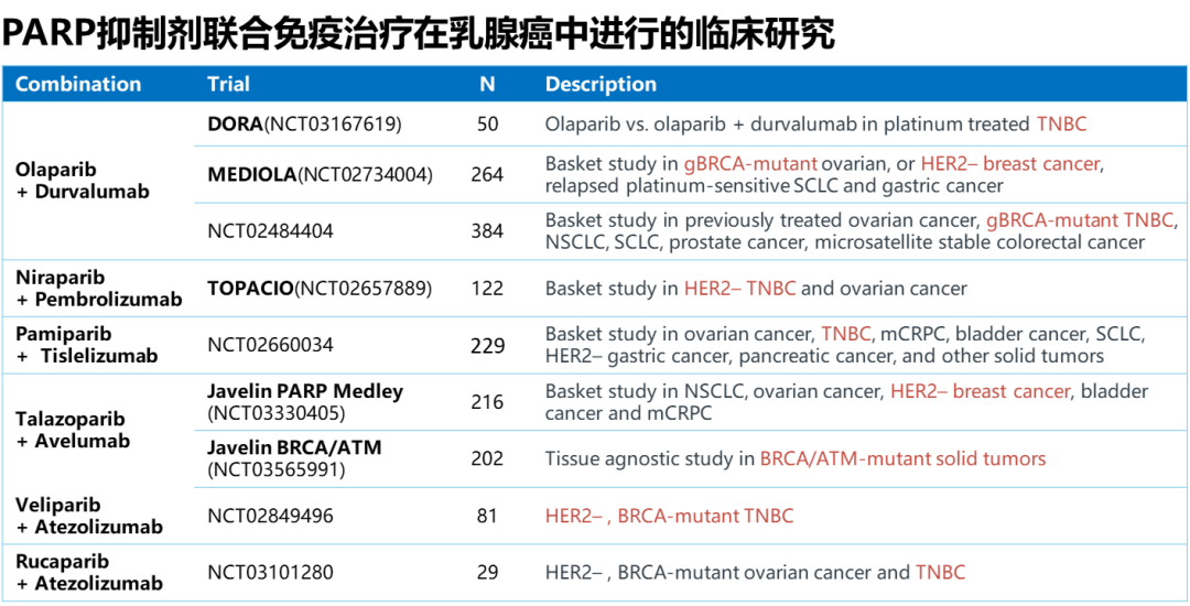 首先MEDIOLA研究,在gBRCAm的HER2阴性晚期乳腺癌中,PARP抑制剂联合PD-L1单抗治疗的初期结果非常令人鼓舞,ORR在1-2线患者达到70%,在3线及以后患者也达到50%,PFS在1-2线患者达到11.7个月(95%CI:4.6-13.8),OS在1-2线患者也达到23.4个月(95%CI: 16.3,NC)。其次,正在开展的DORA研究是探索PARP抑制剂联合PD-L1单抗在铂类敏感晚期三阴乳癌维持治疗中的疗效,该研究是PARP抑制剂正式向乳腺癌的维持治疗推进。帕米帕利与免疫治疗联合也有一些初步探索,初期数据发表在《Lancet Oncology》。以下是PARP抑制剂联合免疫治疗正在开展的一系列研究,期待乳癌领域PARP抑制剂与免疫治疗的火花能够更多地迸发。