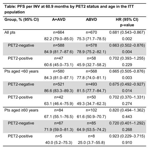 中位随访时间为60.9个月(95%置信区间[CI] 55.2-56.7),估计的5年PFS / INV率分别为A + AVD的82.2%(95%CI 79.0-85.0)和75.3%(95) ABVD的百分比CI为71.7-78.5)。研究者观察A + AVD相比ABVD表现出更好的PFS(危险比[HR] 0.681;95%CI 0.534-0.867;p=0.002)(表1)。在ITT人群中,估计的5年PFS中A + AVD vs ABVD在PET2阴性患者中为84.9%,而在PET2阴性患者中为78.9%(HR 0.663;95%CI 0.502-0.876;p=0.004);PET2-阴性患者中60.6%vs 45.9%。阳性(HR 0.702; 95%CI 0.393-1.255; p=0.229)。在A + AVD和ABVD组中,分别有85%和86%接受治疗的PN患者完全缓解或改善了症状。A + AVD组完成治疗后发生的PN事件的完全解决的中位时间是A + AVD组为34周(范围0-262),ABVD组为16周(范围0-267)。中位改善时间分别为49周(范围8-270)和12周(范围2-70)。A + AVD组中进行中的PN的最大严重程度为1级(17%),2级(9%),3级(3%)和4级(<1%),ABVD组中有1级(14%),2级(6%)或3级(1%)(总计= 21%)。继发性恶性肿瘤分别在A + AVD和ABVD组发生19点和29分。总共报告了131例怀孕。两组患者的持续妊娠或活产比例均相似(A + AVD和ABVD组分别为87%和75%)。