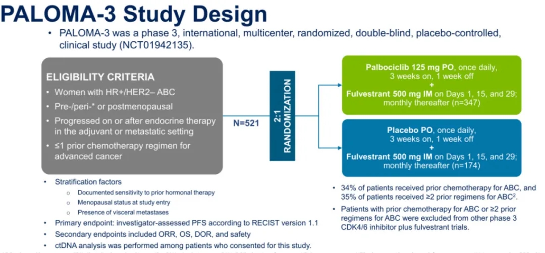 PALOMA-3研究(NCT01942135)是一项国际随机、双盲、安慰剂对照试验,共入组521例在内分泌治疗期间或之后病情进展的HR+/HER2-转移性乳腺癌患者,按2:1随机接受哌柏西利(125mg/天,口服3周,每日一次,连续21天,停药1周,周期28天)+氟维司群(剂量为500mg,肌内注射,前三次注射每14天一次,之后每28天一次)或安慰剂+氟维司群。患者按绝经状态、既往激素治疗的敏感性和内脏转移情况进行分层。主要终点是研究者评估的无进展生存(PFS),次要终点为总生存(OS)、客观缓解率(ORR)、临床获益率(CBR)和安全性。