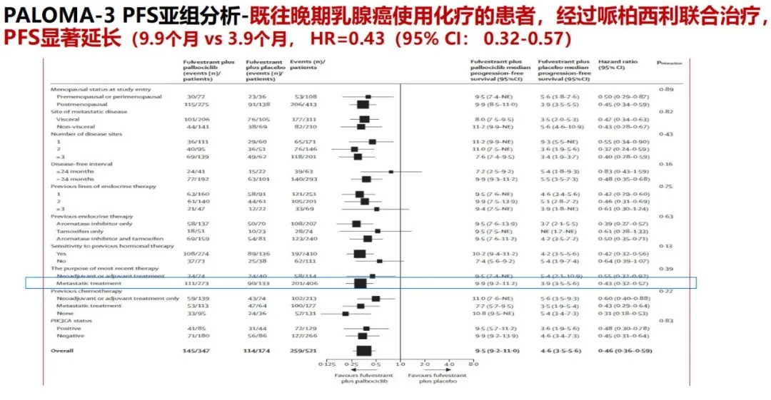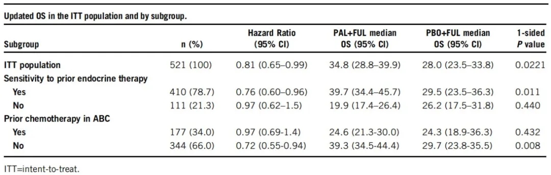 PALOMA-3根据既定的分层因素进行OS亚组分析,除了原发内分泌耐药和既往接受过化疗的患者外,大多数亚组患者都可从哌柏西利联合治疗中获益(表1)。