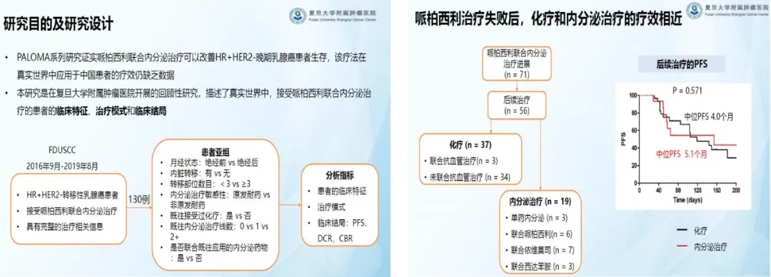 对于接受CDK4/6抑制剂治疗的患者,疾病进展后,患者主要有有两种选择:一种是化疗,另一种是在内分泌的基础上联合其他靶向药物,选择单纯内分泌治疗的效果不是很好。复旦大学附属肿瘤医院开展了哌柏西利真实世界的研究,这项研究也验证了以上治疗模式。