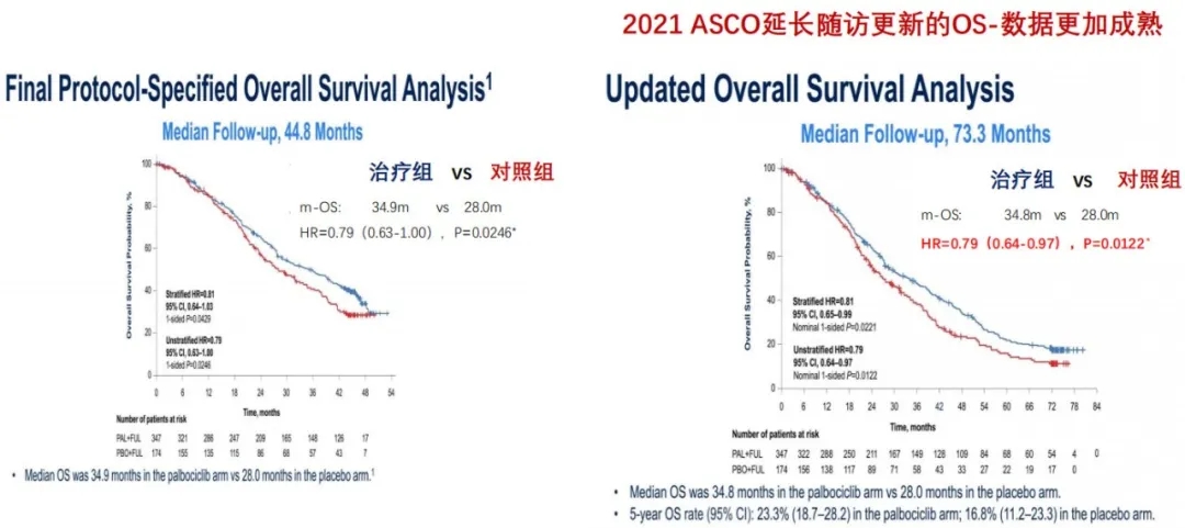 根据2021 ASCO发布的PALOMA-3研究数据更新,对于HR阳性、HER2阴性的晚期乳腺癌患者,哌柏西利+氟维司群在中位随访73.3个月后,与安慰剂+氟维司群相比获得总生存获益。