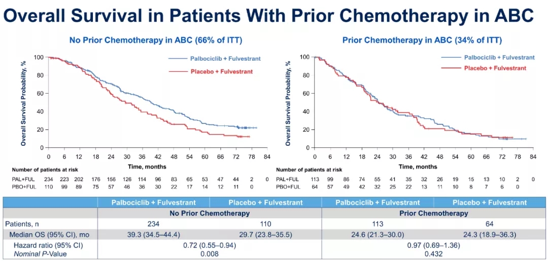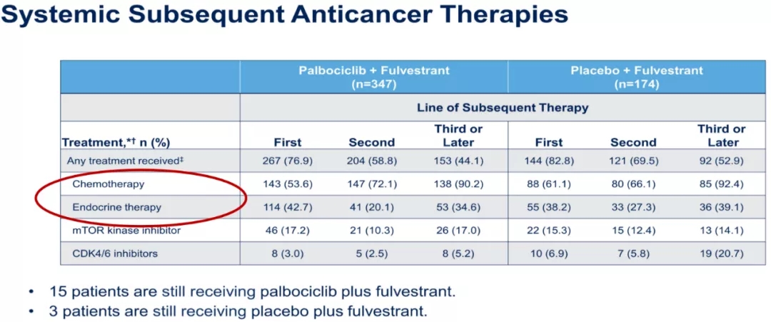 PALOMA-3研究中,哌柏西利联合氟维司群使OS次要终点获益,说明疗效有持续性。在后续治疗中,治疗进展的患者大部分选择化疗或内分泌治疗,这些患者的OS获益结果提示,哌柏西利先用没有影响后续治疗的效果。