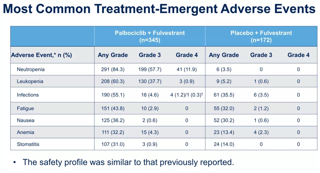 哌柏西利+氟维司群组的最常见的治疗期间不良事件(TEAE)为中性粒细胞减少症和白细胞减少症,发生率分别为84.3%和60.3%,3级事件发生率分别为57.7%和37.7%,4级事件为11.9%和0.9%。未观察到新的安全性信号。
