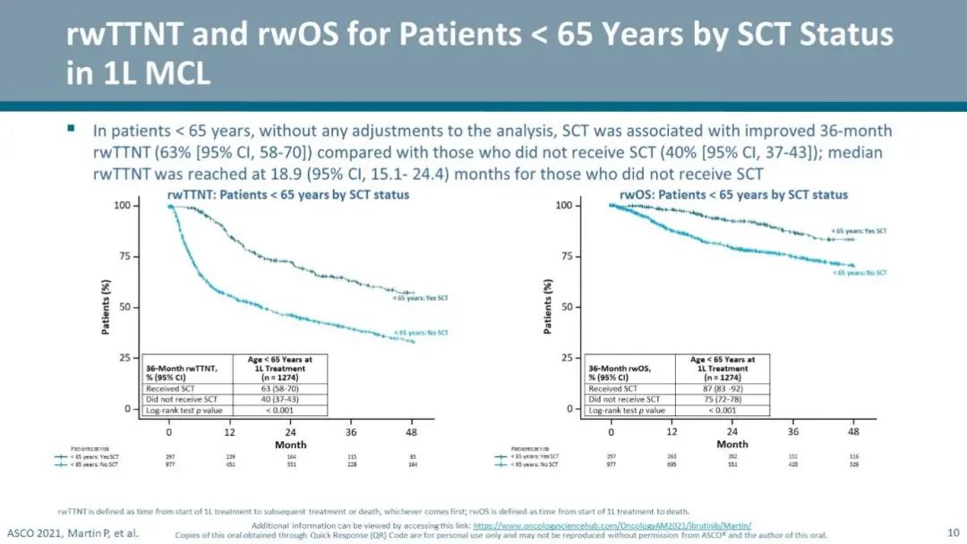 在美国大型真实世界研究中,MCL患者中位一线TTNT是2年。BR是最常用的一线治疗方案。SCT则不常用,即使< 65岁患者,显示真实世界因素可能会影响SCT的适用性和可用性。另外,SCT与OS的关系并不清楚。与其他报道一样,在真实世界中,老年和高危因素预示更差预后,而MR与更好预后相关。该研究显示的预后较前瞻性试验的结果更差,表明需要集中精力研发能够在社区背景中发挥疗效的治疗模式。