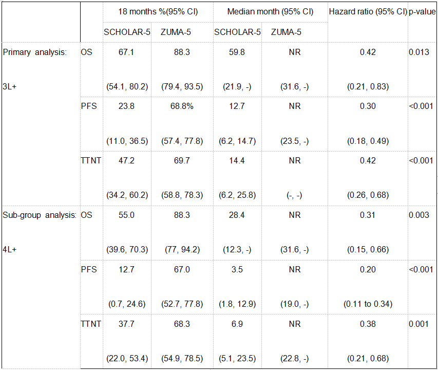 近来,ZUMA-5研究探讨了Axi-cel治疗≥两线治疗后的R/R惰性B-NHL(iNHL)。ZUMA-5研究是一项针对自体抗CD19嵌合抗原受体(CAR)T细胞疗法:Axicabtagene ciloleucel(axi-cel)治疗复发难治性(R/R)惰性非霍奇金淋巴瘤(包括1-3a级别的FL及MZL)患者的2期、多中心、单臂研究。在2020年ASH会议报道了ZUMA-5的中期结果:中位随访17.5月,入组的104例iNHL的总体ORR 92%,CR 76%。其中包含的84例FL患者中,ORR 94%,CR高达80%。2021年6月在南瑞士举办的国际恶性淋巴瘤会议上又报道了ZUMA-5与SCHOLAR-5治疗R/R FL的比较结果。两项研究均选取≥3线治疗后的R/R FL患者,ZUMA-5采用Axi-cel治疗,SCHOLAR-5采用常规化疗及靶向药(包括idelalisib)治疗。两项研究在患者选择,如年龄、POD24比例、既往治疗线数、既往移植比例、末次治疗时间间隔等临床特征方面均无明显差异。结果显示中位随访2年左右时,在≥3线治疗的FL患者中,ZUMA-5研究组的ORR 94.2%,远高于SCHOLAR-5研究组的49.9%。中位TTNT、PFS和OS在ZUMA-5研究中均尚未达到,而SCHOLAR-5研究组分别为14.4、12.7和59.8月。以上生存差异在4线及以后患者中更加明显。