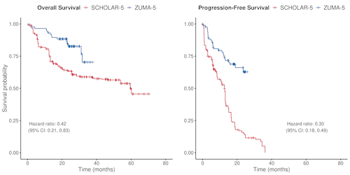 国际S-5队列源数据提取自5个国家的7家机构的R/RFL患者,这些机构在2014年7月后启动了三线或更高(3L+)治疗线(LOT)。关键idelalisib DELTA试验的数据也被纳入S-5队列。Z-5试验合格标准适用于S-5队列,患者在转化时被排除或审查。通过对预先确定的预后因素进行倾向评分和标准化死亡率权重,对S-5和Z-5队列的患者特征进行平衡。治疗组间标准化均数(SMD) <0.1的差异被认为是平衡的。总有效率(ORR)采用比值比(OR)进行比较。采用Kaplan-Meier分析和风险比(HR)评估总生存期(OS)、无进展生存期(PFS)和下一次治疗时间(TTNT)。
