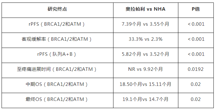 (1)更新PAPR抑制剂奥拉帕利的疗效数据:奥拉帕利的国际多中心III期临床研究PROfound显示,相比较医生选择的新型内分泌药物,奥拉帕利明显提高BRCA1/2和ATM突变患者以及和所有HRR基因突变患者(除BRCA1/2、ATM外还包括BARD1, BRIP1, CDK12, CHEK1, CHEK2, FANCL, PALB2, PPP2R2A, RAD51B, RAD51C, RAD51D, RAD54L))的影像学无进展生存(BRCA1/2和ATM突变患者:7.4 vs 3.6个月, HR=0.34, P<0.001;所有HRR突变患者: 5.8 vs 3.9个月, HR=0.59, P<0.001)和总生存时间(BRCA1/2和ATM突变患者: 19.1 vs 14.7个月, HR=0.69, P=0.02;所有HRR突变患者: 17.3 vs 14.0个月, HR=0.79),并可改善包括ORR、至疼痛进展时间、患者报告的生存治疗评分等多项研究指标。