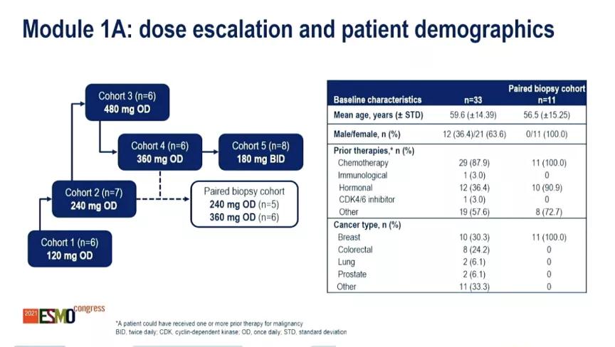 M1A招募了33位患者,分5组,每天口服一次的,有四个剂量组120mg、240mg、360mg、480mg,第5组为180mg 每天口服两次。另有11例患者采用PB队列进行药效学评估。M4 招募了15位患者,M1B招募了23位患者。