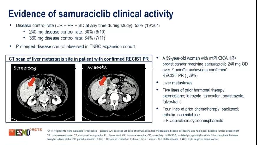 在本研究中,招募的患者有乳腺癌、肠癌、肺癌、前列腺癌等,乳腺癌患者占据大多数,总体的疾病控制率为53%。240mg组疾病控制率为60%;360mg组疾病控制率为64%。雌激素受体阳性(HR+)乳腺癌中,CDK7、cyclin H和MAT1过表达,并在mRNA水平上共同参与调控。研究者分享了一位59岁PIK3CA突变的HR+乳腺癌肝转移患者接受CT7001 240mg单药治疗7个月,肝脏转移灶缩小39%,达到PR。这位患者之前接受了五线内分泌治疗(依西美坦、来曲唑、他莫昔芬、阿那曲唑、氟维司群),四线化疗(紫杉醇、艾立布林、卡培他滨、FEC)。同时在三阴乳腺癌,也看到了CT7001的疗效,有三位患者用药后疾病已经稳定超过一年。药物不良反应主要是1-2级胃肠道症状,没有中性粒细胞的减少,也没有脱发。