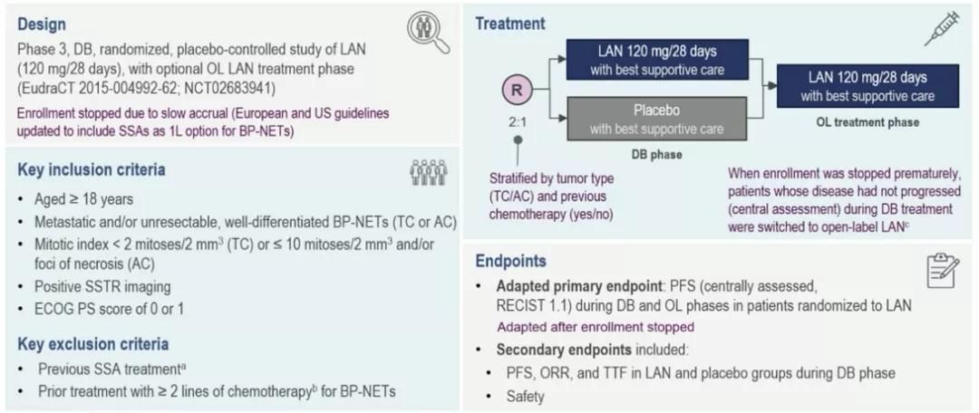 SPINET(EudraCT 2015-004992-62;NCT02683941)是一项关于LAN(120 mg/28天)的3期随机(2 LAN:1 PBO,按TC和AC分层)双盲(DB)研究,且含有一个可选择的开放标签LAN治疗期(OL-LAN)。由于病例招募缓慢,目前已停止入组,正在进行DB阶段的患者可能会过渡到开放标签LAN。主要终点是DB/OL-LAN期LAN组患者(RECIST 1.1)PFS。次要终点包括DB期各治疗组的无进展生存期(PFS)、客观缓解率(ORR)、治疗失败时间(TTF)以及安全性。