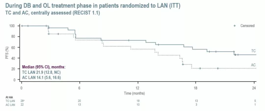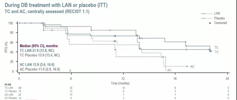 在DB和OL期间,LAN组的中位PFS为16.6(95%CI:12.8~21.9)个月,其中TC患者为21.9(12.8~NC)个月;AC患者为14.1(5.6~16.6)个月。在DB期的TC患者中,LAN组和安慰剂组的PFS分别为21.9(13.8~NC)个月和13.9(13.4~NC)个月;在DB期的AC中患者中,LAN组和安慰剂组的分别为13.8(5.6~16.6)个月和11.0(2.8~16.9)个月。其他关键次要终点结果如下表所示。