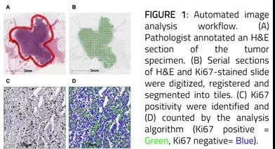 2021 SABCS上有2项壁报评估HR+/HER2-患者Ki-67与复发评分(Recurrence scores,RS)相关性,一项来自KPNC(Kaiser Permanente Northern California)的研究纳入307例患者(P1-08-10)和1项来自加拿大的研究纳入606例患者(P1-08-01)。研究显示不同的病理医生对同一患者Ki-67的评估具有偏差(图9);2项研究均尝试应用图像自动分析系统检测Ki-67,结果显示与病理医生评估的一致性较高(图10)。