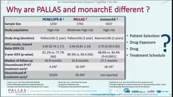 与晚期乳腺癌CDK4/6抑制剂一致性获益结果不同,早期乳腺癌辅助强化相左的结果令我们不得不去思索原因(图3),考虑可能的原因如人群筛选(PALLS未进行高危筛选,但入组以中高危为主,而且既往报道高危亚组也无获益)、药物暴露(AE导致Palbociclib停药率高)、药物不同(Abemaciclib与Palbociclib化学结构式不同)以及治疗方案(Abemaciclib为连续用药,而Palbociclib为用3周停1周方案)。