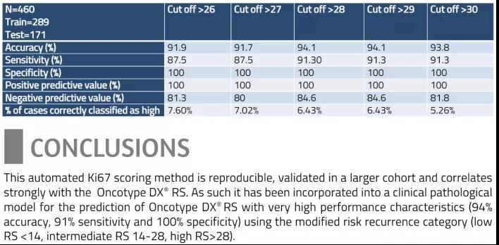 加拿大研究显示自动Ki-67评分系统与RS具有高度相关性,整合临床病理模型预测RS结果的准确度为94%、敏感度为91%和特异性为100%(图11);但KPNC研究结果则不同,显示5%-10%的Ki-67≤5%或10%的患者具有高RS≥26,超过48%的Ki-67≥30%患者具有低RS<26,提示Ki-67的检测并不足够,在临床中依然需要同时检测21基因或其它多基因检测共同预测复发风险(图12)。