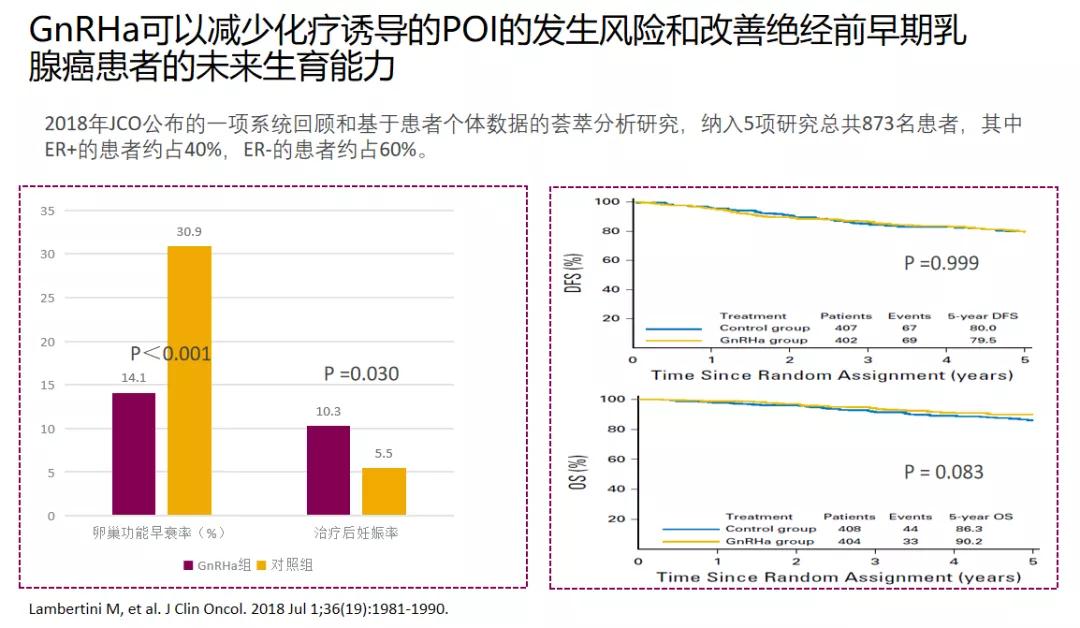另外一项则是2018年发表在JCO杂志上的荟萃分析,纳入5项研究总共873名患者,其中ER+患者约占40%,结果同样显示在化疗基础上联合GnRHa可以显著降低卵巢早衰率,提高治疗后的妊娠率,而且对EFS和OS无显著影响。该荟萃分析的结果与以上两项主流的临床研究非常类似,均表明GnRHa在乳腺癌化疗患者中具有卵巢功能保护作用。