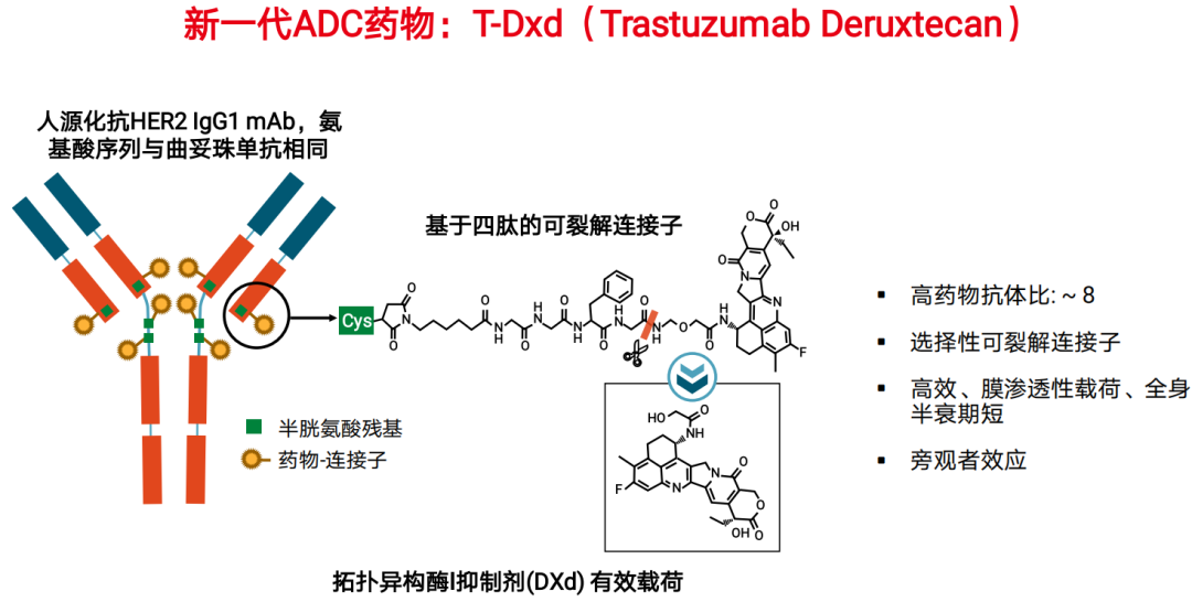 T-DXd是阿斯利康(AstraZeneca)和第一三共(Daiichi Sankyo)联合开发的一种新型抗HER2靶向抗体偶联药物(ADC),以第一三共原研独创的DXd ADC技术为依托,由人源化抗HER2 lgG1抗体、可裂解的四肽连接子和拓扑异构酶Ⅰ抑制剂(喜树碱衍生物DXd)有效载荷组成。