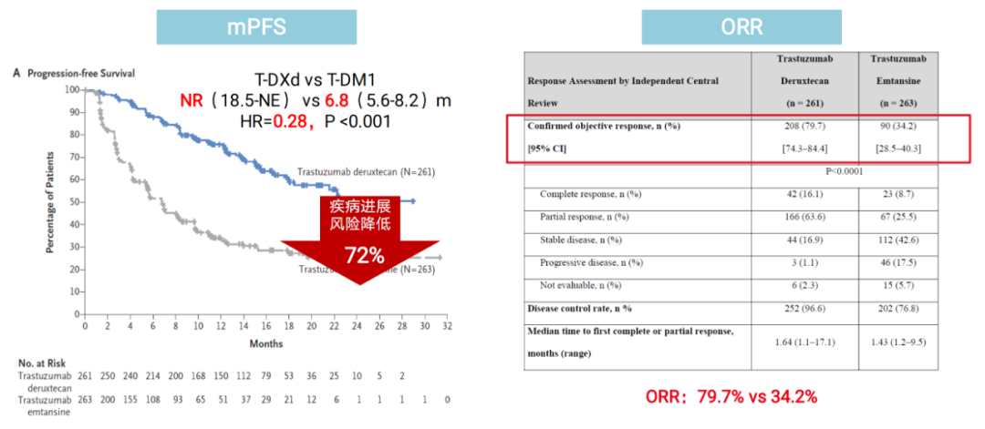 2022年3月NEJM发表的Ⅲ期DESTINY-Breast03研究显示,T-DXd相较于T-DM1可显著降低72%的疾病进展风险(HR 0.28,95%CI:0.22-0.37,P<0.001),ORR则翻了两倍多(79.7% vs 34.2%)。