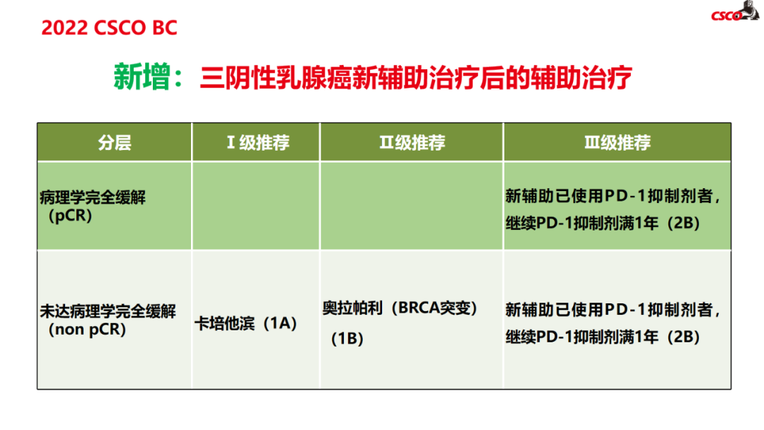 2022版CSCO BC指南还新增TNBC新辅助治疗后的辅助治疗推荐。主要按达到pCR和未达到pCR进行分层。其中,基于CREATE-X研究结果,新辅助治疗后未达到 pCR 的患者I级推荐卡培他滨(1A)。