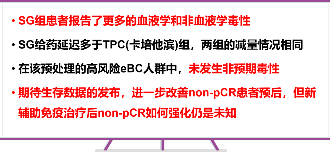 TNBC:SG在新辅助治疗后复发风险较高的原发性HER2阴性乳腺癌患者中初步体现出较好的安全性,其疗效数据值得期待;Meta分析提示TNBC患者可从新辅助免疫治疗中获益,优势获益人群的确定是亟待解决的问题。