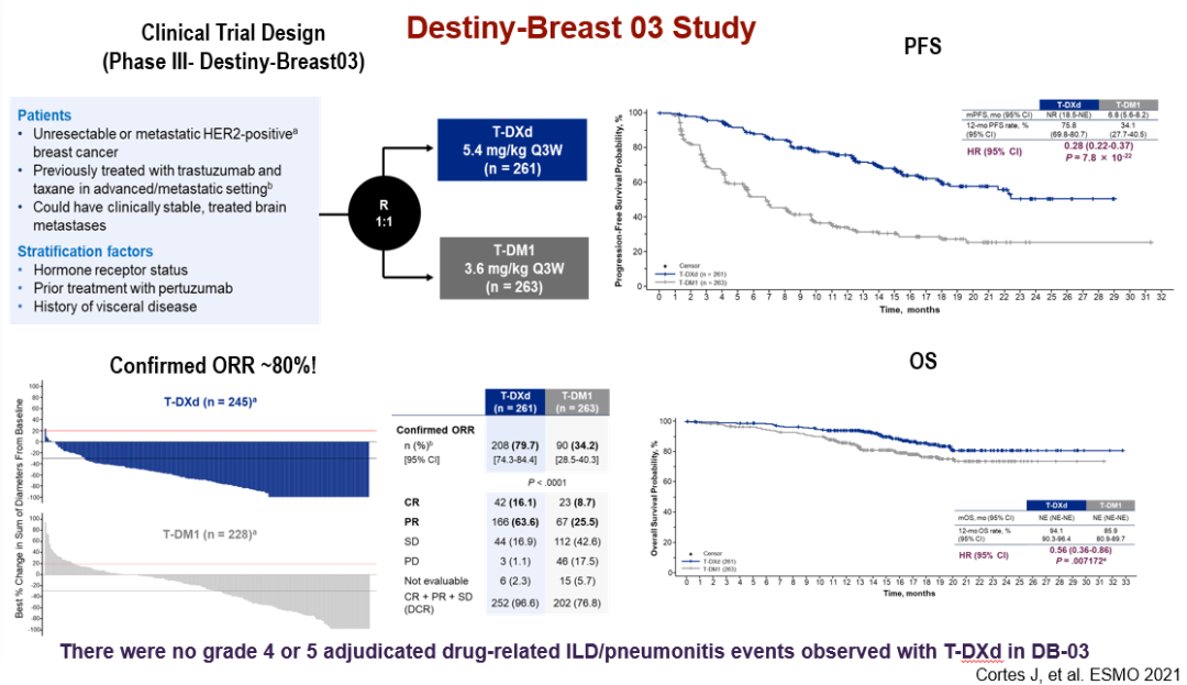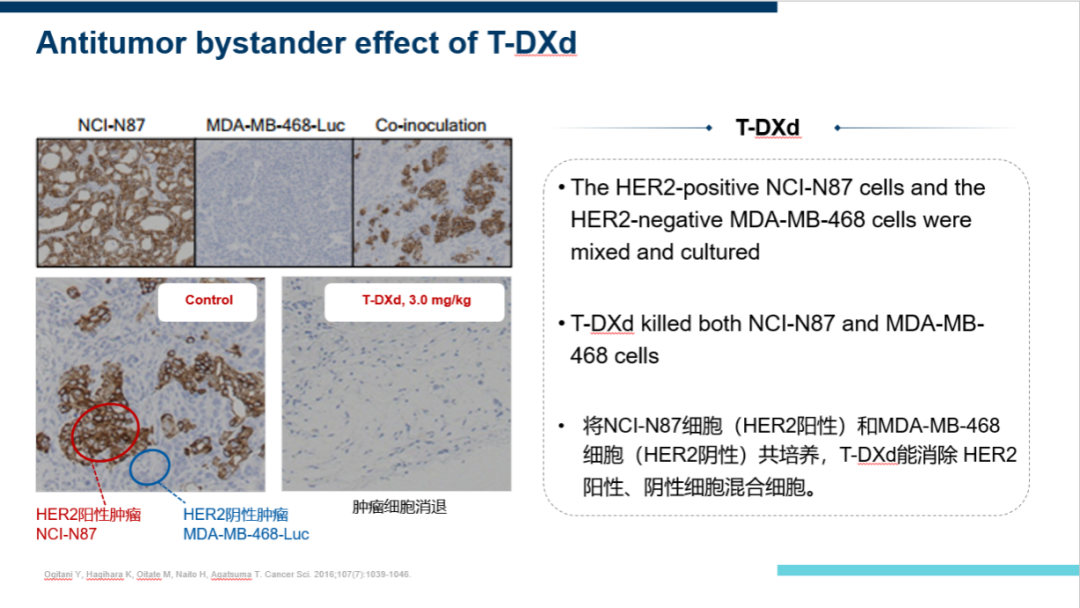 Mark D.Pegram教授在讲课中还提到,T-DXd作为新一代的ADC,重新结构优化了有效载荷以及连接子,被内吞进入肿瘤细胞时释放有效载荷抑制拓扑异构酶Ⅰ并导致细胞死亡,这种高效和低毒的特性,使它不同于其他靶向HER2 ADC药物;T-DXd采用了可裂解的连接子,同时释放的载药DXd具备良好的细胞膜渗透性,使得T-DXd不仅能杀伤HER2阳性肿瘤细胞还能透过细胞膜攻击邻近的HER2阴性的肿瘤细胞,因此对异质性的肿瘤团块起到一定的杀伤作用。T-DXd在一定程度上克服瘤内HER2的异质性也能解释DESTINY-Breast 03研究中在HER2阳性患者突破性的获益:PFS超过2年,ORR接近80%。对于HER2低表达的患者,DESTINY-Breast04研究也取得了较好的生存结果。