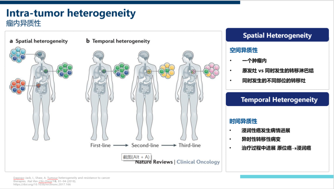 薛妍教授在讲课中提到,瘤内异质性可进一步分为空间异质性和时间异质性。空间异质性主要指在同一个肿瘤内或者是不同部位之间存在的差异;时间异质性主要指的是随着时间推移而发生的改变。