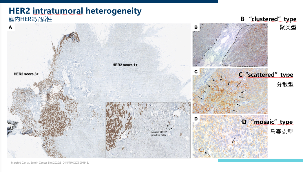 当前瘤内HER2异质性尚未有明确共识定义,既往的研究中研究者大多认为瘤内HER2异质性肿瘤表现于瘤内HER2表达分布的不均一,或肿瘤细胞HER2表达强度的不一致。HER2的瘤内异质性在IHC上的表现可具体分为3个亚型,一是聚类型(“clustered”type),即两种不同的肿瘤细胞像地图样分布;二是分散型(“scattered”type),即在HER2-的肿瘤细胞中可以看到孤立HER2+细胞;三是马赛克型(“mosaic”type),即不同状态的肿瘤细胞任意混合分布。