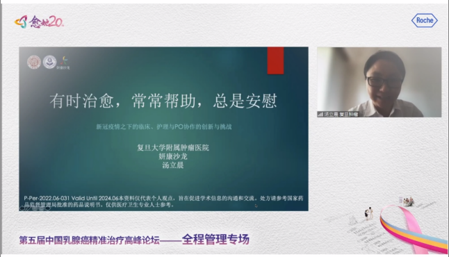 复旦大学附属肿瘤医院汤立晨教授分享了沈镇宙教授倡导成立的全国首家医院开设的医护患三位一体的患者支持组织——妍康沙龙为患者寻医问药、康复护理以及社会支持等方方面面带来的帮助。随后汤立晨教授与瑞安市人民医院林爱真教授、南京鼓楼医院严婷婷教授、河南省肿瘤医院王欣教授对疫情常态化之下的临床、护理与PO协作创新与挑战进行全面剖析与经验分享,提供了日常护理、随访等个案管理等方面的建设性指导意见。