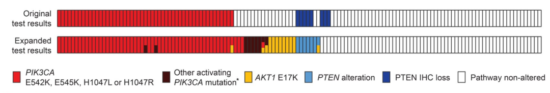 FAKTION是一项旨在评价AKT抑制剂(AKTi)Capivasertib±氟维司群用于AI失败HR+/HER2-晚期乳腺癌治疗的Ⅱ期研究,既往中期分析(ASCO 2019)显示Capivasertib联合组可显著改善患者PFS(10.3 vs 4.8个月,HR 0.58,95%CI:0.39~0.85;P=0.0049),而且Capivasertib治疗的获益并不局限在PI3K/AKT/PTEN通路改变(HR 0.59),无通路改变(HR 0.56)也可获益,即通路对PFS没有影响。这次ASCO大会报告了首次OS数据,而且采用NGS检测(比以往使用的ddPCR)增加了PI3K/AKT/PTEN通路的检测位点(下图),进一步分析通路改变对OS和PFS的影响。