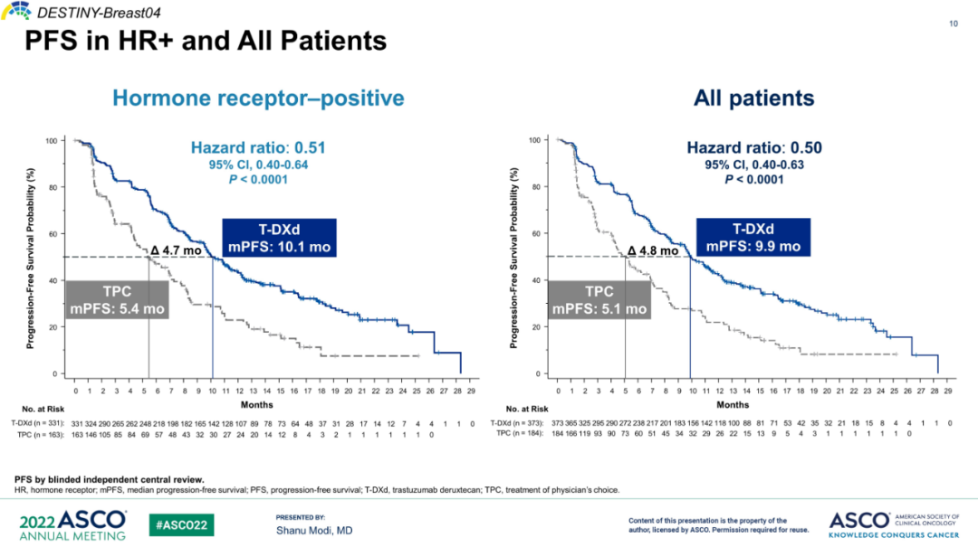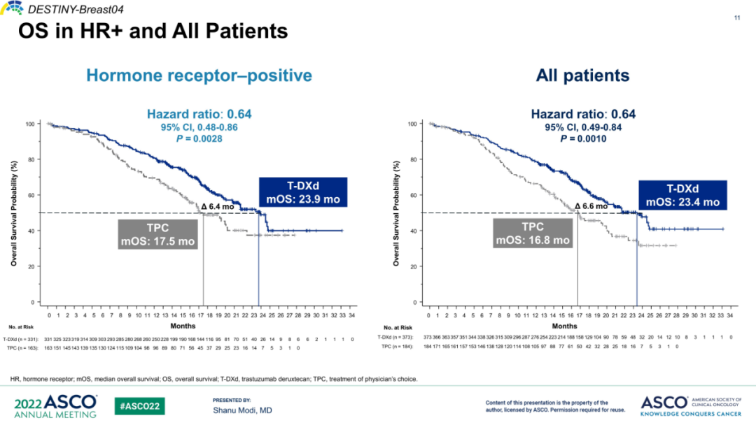 △DB-04研究总体人群和HR+患者的PFS和OS K-M曲线