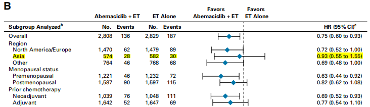 化疗序贯内分泌治疗作为重要的治疗手段多年来一直作为HR+/HER2-型早期乳腺癌的标准治疗。细胞周期蛋白依赖性激酶4/6抑制剂(CDK4/6抑制剂)的问世改变了HR+/HER2-型早期乳腺癌高危患者的治疗模式。monarchE研究旨在探索阿贝西利联合内分泌治疗在高危HR+/HER2-早期乳腺癌患者的疗效及安全性,研究结果显示阿贝西利改善了患者的无侵袭性疾病生存期iDFS(2年iDFS:92.2% vs 88.7%;3年iDFS:88.8% vs 83.4%),但在初次结果公布时从亚组分析结果显示亚洲人群相比其他地区人群获益较少4,5。同时阿贝西利的非血液学毒性(例如:腹泻发生率为82.2%,≥3级腹泻发生率为7.6%,因腹泻导致停药率为4.8%)为阿贝西利在辅助治疗长达2年的用药埋下一丝隐患4