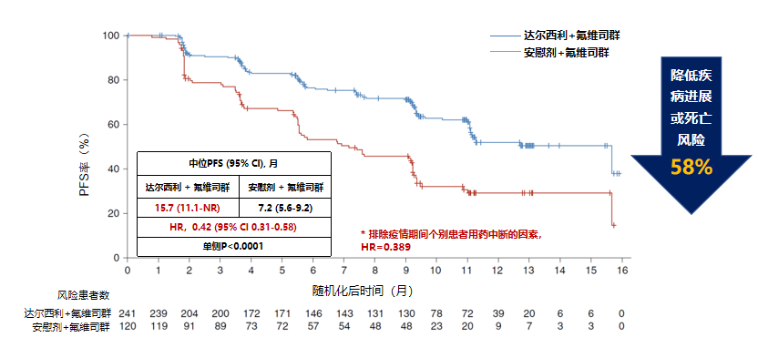 1)强效:DAWNA-1研究中达尔西利联合氟维司群显著延长中位无疾病进展生存期,mPFS达到15.7个月,较对照组提高8.5个月,HR值 0.42;推迟了患者的化疗时间从而提高患者的生活质量(HR值 0.47)。