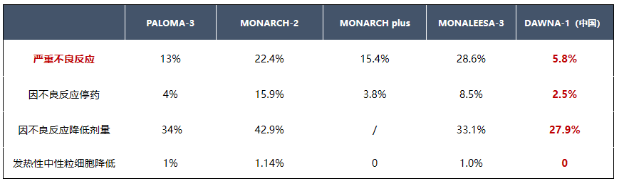 3.达尔西利在DAWNA-1研究中展示出不良反应更为单一且集中(主要不良反应为血液学毒性,其它不良反应发生率极低),相比其他CDK4/6抑制剂更易管理6。在与其他CDK4/6抑制剂晚期系列研究相比,达尔西利在严重不良反应发生率、因AE降低剂量和发热性粒缺的发生率等方面都优于同类产品6-11。这使得达尔西利在辅助治疗长达两年的持续用药中,患者的依从性得到了有力的保障,进而为患者带来更多疗效上的获益。