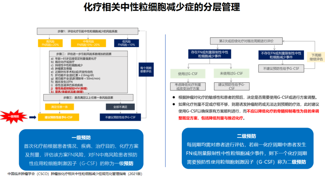 对于化疗所致的中性粒细胞减少,我们需要进行分层管理,因为不同药物所致白细胞下降的程度也是不同的。我们根据中性粒细胞缺乏伴发热的风险程度,把患者分为高风险、中风险、低风险三大类。对于高风险患者,我们建议采用一级预防,让患者平安的度过化疗过程。对于其他患者,我们要在充分评估患者的一般状态以后,再决定是否要进行预防给药。但是在临床上,一级预防会有很多的局限性。第一,部分药物未进入医保目录,患者受经济因素限制,不愿意接受相关药物治疗。第二,患者由于自身因素会抱有风险侥幸心理,所以不愿意接受相关的治疗药物。这个时候,我们更多的是采用二级预防。即当患者发生粒细胞缺乏和发热后,第二次化疗时我们也可以预防性使用升白药物。