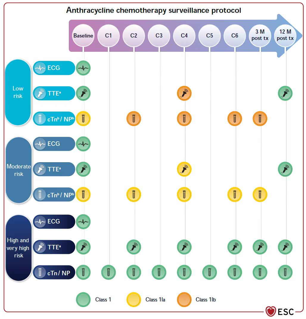在抗肿瘤治疗期间提供详细的监测途径,包括三维超声心动图、GLS和心脏生物标志物,以检测基于特定抗肿瘤治疗和基线心血管毒性风险。